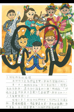 My uncle is a music lover and is always kind to me. My mother told me one day that my uncle was getting married. The wedding would have two grooms, and my uncle would have an adopted child! My mother said, "Getting married is about finding someone you love and can live happily with." Our whole family was happy! Lots of my uncle's friends came to the wedding. They went on stage to sing and dance. The whole wedding became like a musical carnival and was really fun! I played a violin piece to wish the grooms happiness and joy.