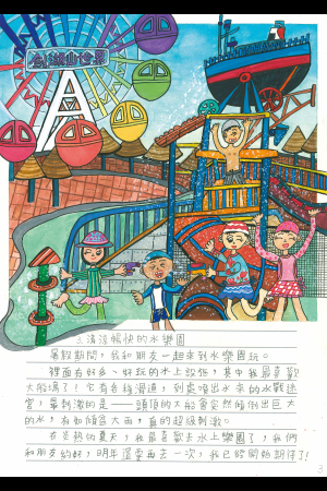 My friends and I went to play at the water park during the summer vacation. It had lots of water attractions. My favorite was a big dock! It has all kinds of slides and a water battle maze that sprays water everywhere. The most thrilling part is when a huge bucket of water suddenly tips over and being underneath is like being in a torrential downpour. It's super exciting. Going to the water park is my favorite thing to do in the hot summer.