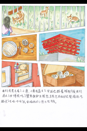 The first thing we did was go see the young deer. They were lying comfortably under the blue sky and were adorable to watch. We also visited the World Expo Park and enjoyed hairy crab roe noodles and sheng jian bao pan-fried pork buns. The bottoms of the sheng jian bao were crispy and made a crunchy sound as we ate. A bear cub on Anfu Road was also cute.