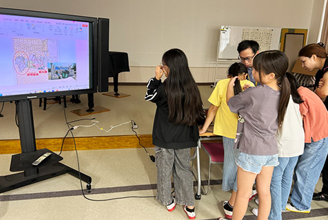 1コマ目、低学年対象の授業では、SDGs達成目標である2030年の、自分や神戸市、世界全体の姿を想像しながら、日本やアジア、世界がどうなっているか考える二択問題から授業がスタートしました。問いかけにも積極的に発表してもらい、初めて見る文字や文化に触れてもらうことができました。