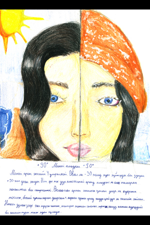 この夏、私は初めてゴビ砂漠(モンゴル南部と中国北部に位置する)の息をのむような蜃気楼を見ました。この体験は決して忘れられないでしょう。私と家族はオムノゴビ県(モンゴル南部の砂丘地帯)を訪れ、砂の城を作って一日を過ごしました。暑くて喉がかわき、日が暮れてきたので、私たちは歩いて帰りはじめました。途中、私は砂丘の上に巨大な水龍が、その尾で大地に水をまいているような蜃気楼を見ました。その瞬間、私は命の宝石である水の重要な役割を実感しました。