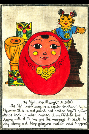ピェッタインダウンはミャンマーの伝統的なおもちゃです。赤くて丸くて笑っているおもちゃです。倒そうとしても起きあがります。子どもたちはこれで遊ぶのが大好きです。どんなことがあっても、強く生き続けようというメッセージを人びとに与えてくれます!