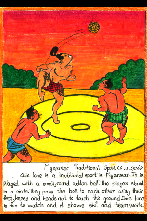 チンローンはミャンマーの伝統的なスポーツです。小さくて丸い籐のボールを使います。選手は輪の中に立って、足、膝、頭を使い、地面にボールがつかないようにパスし合います。チンローンは見ていて楽しいし、技術とチームワークを見せてくれます。