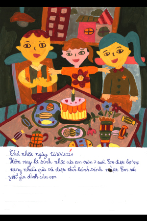今日は私の7歳の誕生日です。両親からたくさんのプレゼントをもらい、誕生日ケーキのロウソクを吹きけしました。私は家族が大好きです。
