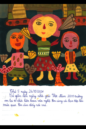 毎年11月20日(ベトナム教師の日)が近づくと、私の学校では芸術祭が開催されます。友だちといっしょに扇子ダンスを練習しました。とても楽しかったです。