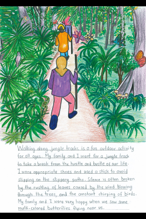 ジャングルを歩くのは、どんな年齢の人にも楽しいアウトドア・アクティビティです。日常のあわただしさから離れひと休みするため、ぼくは家族といっしょにジャングルを歩きました。適切な靴をはき、すべりやすい道ですべらないように棒を使いました。静けさはしばしば、吹きぬける風による葉のざわめきや絶え間ない鳥のさえずりで破られます。色とりどりの蝶が私たちの近くを飛んでいるのを見た時は、ぼくも家族もうれしかったです。