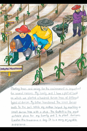 木を植えて環境へ配慮することは、いくつかの理由から重要です。ぼくと家族は品種が異なる100本のドリアンの木を植えた畑を持っています。お父さんは種をまいたドリアンを植えかえました。同時に、お母さんは小さなドリアンの木の支柱に印をつけて作業を手伝います。山の丘はぼくや家族にとって、ドリアンを植えるのに最も適した場所です。ぼくは1日1回、木に水をやります。とても楽しい経験です。