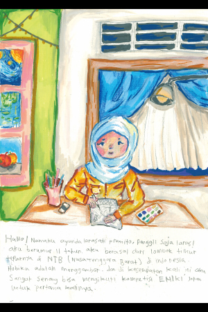 こんにちは!私の名前はアユンダ・ララサティ・プラミトですが、ララスと呼んでください。私は11歳です。出身はインドネシアの東ロンボク(ロンボク島の東側)、正確にはNTB(ヌサ・トゥンガラ・バラット)というところです。趣味は絵を描くことです。今回初めて日本の絵日記コンクールに参加できてとてもうれしいです!